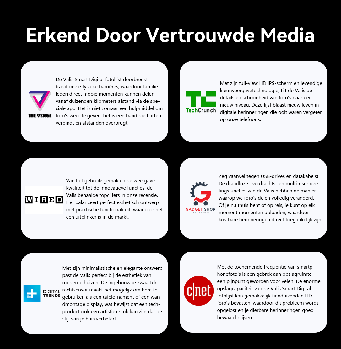 Het resultaat was het Valis Smart Photo Frame—met krachtige Wi-Fi en een eenvoudig, gebruiksvriendelijk ontwerp maakt het delen moeiteloos terwijl elk moment in levendig HD wordt getoond. De missie van Valis is duidelijk: digitale rommel omzetten in de vreugde van het delen, zodat je je kunt concentreren op de herinneringen, niet de technologie.