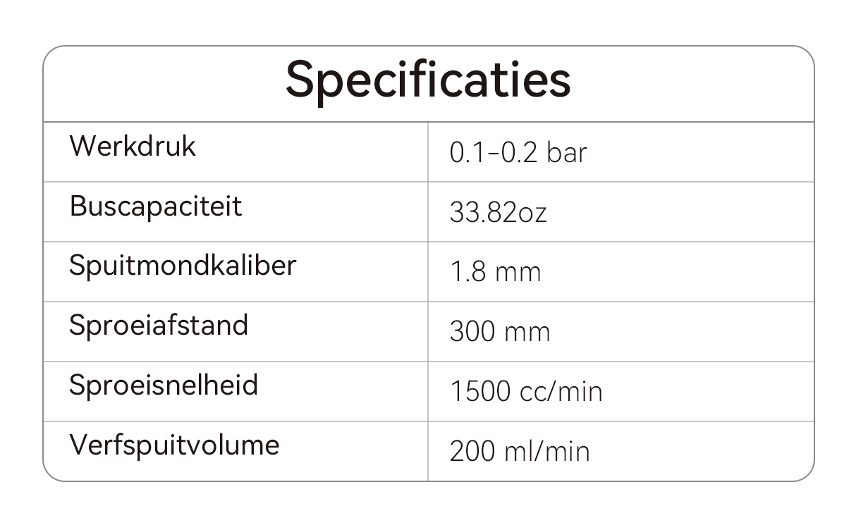 Bereik professionele resultaten met nauwkeurige controle over de verfstraal en spuitpatronen. Deze tool zorgt ervoor dat elke laag gelijkmatig en glad is, wat het perfect maakt voor gedetailleerde projecten zoals fijnmeubels, modellen of kunstwerken, zodat je werk een vlekkeloze afwerking krijgt.