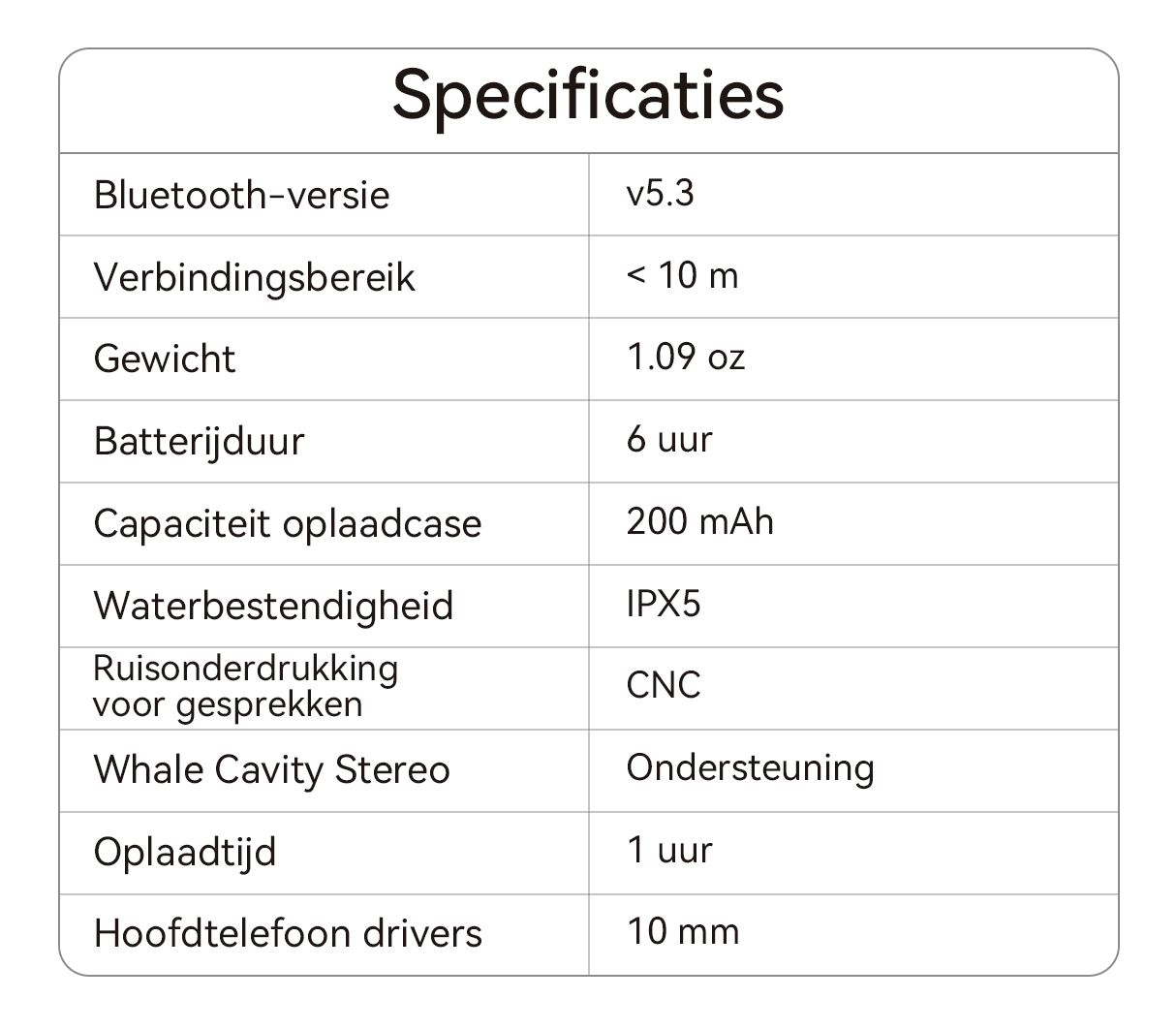 - Lange Batterij & Oplaadcase — 24 uur speeltijd, 480 uur standby, snel opladen